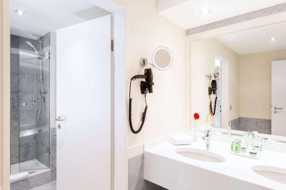 Direkt an einem friedlichen See im grünen Gürtel der Stadt und neben dem geschäftigen Mediapark gelegen, befindet sich das NH Collection Köln Mediapark Hotel strategisch günstig zwischen der natürlichen Schönheit und dem wirtschaftlichen Zentrum von Köln. Der französische Architekt Jean Nouvel entwarf das moderne Hotel neben dem Kölner Dom, dem höchsten Gebäude Kölns, wobei er sowohl Geschäfts- als auch Freizeitreisende im Blick hatte. Ein kurzer Spaziergang zum Hansaring verbindet die Gäste mit der historischen Innenstadt von Köln und berühmten Sehenswürdigkeiten wie dem Kölner Dom, dem Kölner Zoo, dem Botanischen Garten Flora, dem Römisch-Germanischen Museum, dem Schokoladenmuseum und dem Kölner Weihnachtsmarkt. Alle 217 modernen Zimmer des Hotels verfügen über geräumige Badezimmer, begehbare Kleiderschränke, Nespresso-Maschinen und Wasserkocher. Viele bieten einen Blick auf den See und den Kölner Dom. Das NH Collection Köln Mediapark bietet seinen Gästen außerdem einen 24-Stunden-Fitnessraum und Saunaf facilities. Jeden Morgen bietet das Hotel ein gesundes Buffet mit frischen Säften, Käse, Aufschnitt und Gebäck. Später am Tag empfängt das Hotelrestaurant die Gäste zu regionalen und saisonalen Gerichten zum Mittag- und Abendessen. In den wärmeren Monaten können die Gäste ihre Mahlzeiten mit einem kalten Kölsch oder einem Cocktail auf der Seeterrasse genießen. Die 7 Tagungsräume des Hotels bieten Platz für kleine und große Veranstaltungen mit bis zu 250 Teilnehmern.