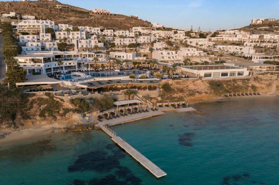 Direkt am hoteleigenen Sand-/Felsstrand gelegenes Hotel, besonders bei Hochzeitsreisenden beliebt. Am Strand sind Sonnenschirme und Sonnenliegen kostenlos verfügbar. Zum touristischen Zentrum sind es ca. 4 km. Die Stadt Chora ist ca. 4 km entfernt. Ein Supermarkt ist nach ca. 700 m zu erreichen. Zu den nächsten Bars und Restaurants gelangt man nach rund 4 km. Auch die nächste Diskothek liegt rund 4 km entfernt. Für Mobilität sorgt eine Bushaltestelle (ca. 100 m entfernt). Zur ärztlichen Versorgung im Notfall befindet sich ein Krankenhaus in etwa 4 km Entfernung. Der Flughafen (JMK) ist ca. 5 km entfernt. Zwischen Hotel und Flughafen verkehrt ein kostenloses Shuttle (privater Bodentransfer). Auch zum nächsten Strand wird von April bis Oktober ein Shuttle (gegen Gebühr) angeboten.