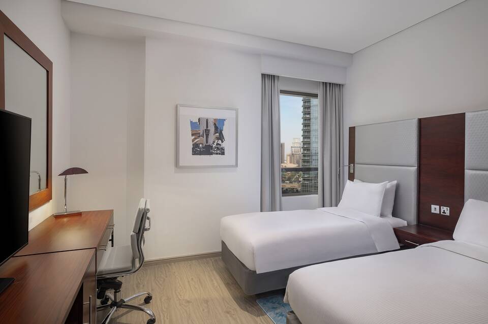 Das Hotel im modernen Stil ist mit dem Schwesternhotel Hilton Dubai Jumeirah über eine Brücke verbunden und beherbergt verschiedene Unterkünfte mit fantastischer Lage an der Strandpromenade „The Walk“.
