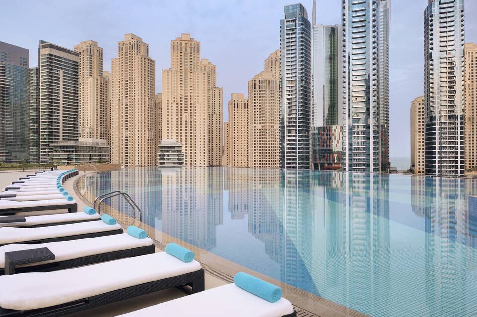 Das Hotel JW Marriott Hotel Marina (Ex. The Address Dubai Marina) befindet sich ca. 5 km vom Strand entfernt. Zum touristischen Zentrum sind es ca. 1 km. Die Stadt Dubai City Centre ist ca. 20 km entfernt (DXB Airport ca. 40 km). Einkaufsmöglichkeiten liegen ca. 1 km vom Hotel, ein Supermarkt ist nach ca. 100 m zu erreichen. Zu den nächsten Bars und Restaurants gelangt man ebenfalls nach rund 1 km. Auch die nächste Diskothek liegt rund 1 km entfernt. Weitere Unterhaltungsangebote wie ein Kino und ein Theater sind in ca. 1 km Entfernung zu finden. Für Mobilität im Urlaub sorgen neben einem Mietwagen-Verleih auch ein Taxistand sowie eine Bushaltestelle in etwa 1 km Entfernung. Weiter entfernt gelegene Orte lassen sich über den Bahnhof in rund 300 m Entfernung erreichen. Zur ärztlichen Versorgung im Notfall befindet sich ein Krankenhaus in etwa 3 km Entfernung. Der Flughafen (AUH) ist ca. 96 km entfernt. Ein weiterer Flughafen (DXB) liegt in etwa 32 km Entfernung.