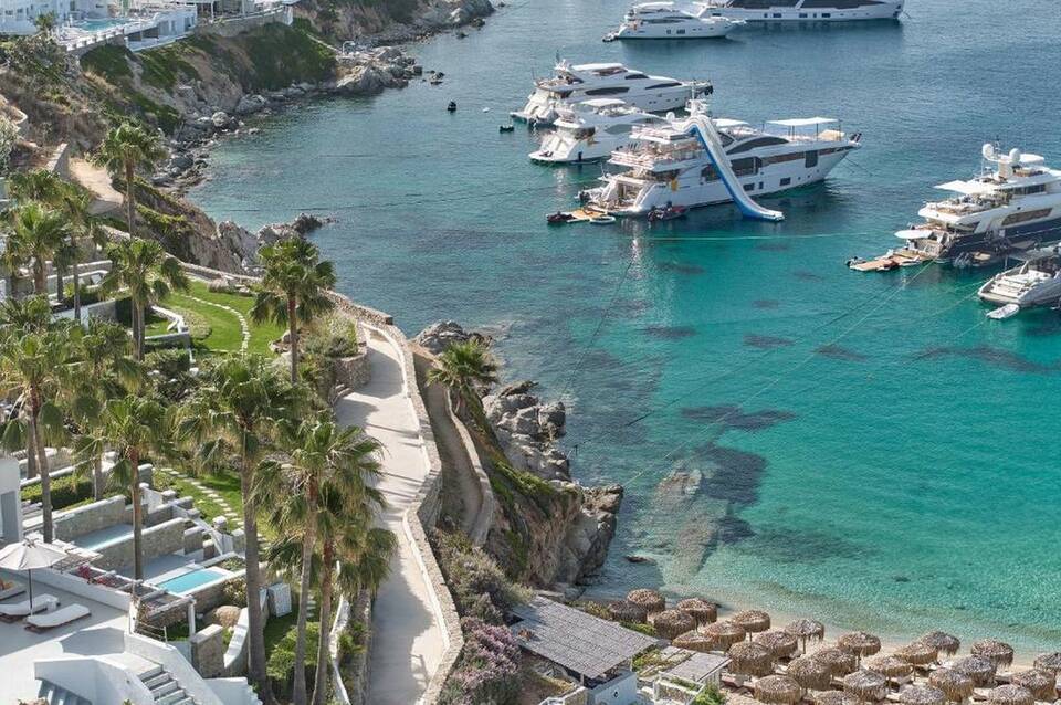 Das Hotel Mykonos Blu, A Grecotel Resort to Live, das sich besonders bei Hochzeitsreisenden großer Beliebheit erfreut, befindet sich ca. 3 km von Mykonos entfernt. Der nächste Strand, ein privater Sandstrand, liegt in der Umgebung. Am Strand sind Sonnenschirme und Sonnenliegen kostenlos verfügbar. Zum touristischen Zentrum sind es ca. 3 km. Einkaufsmöglichkeiten liegen ca. 2 km vom Hotel, ein Supermarkt ist nach ca. 1 km zu erreichen. Die nächstgelegenen Bars und Restaurants erreichen Sie nach rund 200 m. Zur nächsten Diskothek gelangt man nach rund 3 km. Weitere Unterhaltungsangebote wie ein Kino sind in ca. 3 km Entfernung zu finden. Folgende Sehenswürdigkeiten sind vom Hotel aus erreichbar: Delos island (ca. 16,1 km), Armenistis Lighthouse (ca. 9 km), Windmills (ca. 3 km) und Little Venice (ca. 3 km). Für Mobilität im Urlaub sorgen neben einem Mietwagen-Verleih auch ein Motorrad-Verleih, ein Taxistand (ca. 200 m) und eine Bushaltestelle (ca. 10 m entfernt). Zur ärztlichen Versorgung im Notfall befindet sich ein Krankenhaus in etwa 4 km Entfernung. Der Flughafen (JMK) ist ca. 6 km entfernt. Zwischen Hotel und Flughafen verkehrt (gegen Gebühr) ein Shuttle (privater Bodentransfer).