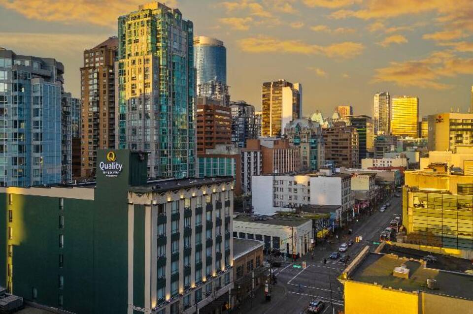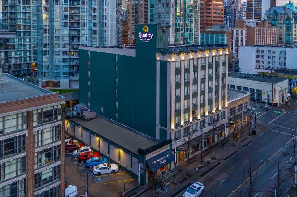 Das Quality Inn & Suites Downtown Vancouver befindet sich in idealer Lage im Herzen des Unterhaltungsviertels von Vancouver, nur wenige Gehminuten von der English Bay und dem Stanley Park entfernt. Granville Island ist nur eine kurze Aquabus-Fahrt entfernt. Zu den nahegelegenen Attraktionen gehören die Rogers Arena, das Vancouver Convention Centre, Science World, Chinatown und das Finanzviertel der Stadt. Musikliebhaber können ein Konzert im The Vogue, The Commodore Ballroom oder im Orpheum Theatre besuchen. Das Hotel bietet Speisen im hoteleigenen Morrissey Public House Restaurant und Cocktails in der Ginger 62 Lounge. Zu den Annehmlichkeiten gehören Wäsche- und Valet-Service, Tagungsräume, ein Businesscenter und kostenfreies WLAN. Die Zimmer verfügen über Kaffeemaschinen, Haartrockner und Klimaanlage. Suiten mit Schlafsofas und voll ausgestatteten Küchen sind ebenfalls verfügbar. Parkplätze stehen gegen Gebühr zur Verfügung. Kinder und Jugendliche bis 17 Jahre übernachten kostenlos im Zimmer der Eltern.