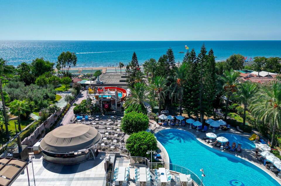 Direkt am Sand-/Kiesstrand gelegenes Hotel. Die Stadt Side ist ca. 5 km entfernt (Manavgat ca. 9 km, Antalya ca. 75 km). Für Mobilität sorgt ein Mietwagen-Verleih. Der Flughafen (AYT) ist ca. 60 km entfernt. Ein weiterer Flughafen (GZP) liegt in etwa 110 km Entfernung.