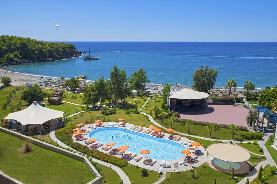 Rund 50 m vom hoteleigenen Sand-/Kiesstrand entfernt gelegenes Hotel. Am Strand sind Sonnenschirme und Sonnenliegen kostenlos verfügbar. Die Stadt Alanya ist ca. 35 km entfernt (Manavgat ca. 25 km). Für Mobilität sorgt neben einem Mietwagen-Verleih auch ein Motorrad-Verleih. Der Flughafen (AYT) ist ca. 95 km entfernt. Ein weiterer Flughafen (GZP) liegt in etwa 75 km Entfernung.